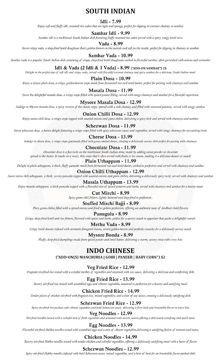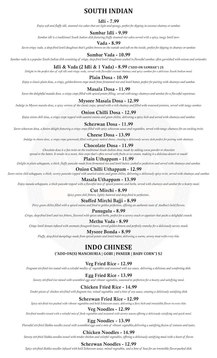 You’ll find an inviting variety of options, from warm, soothing soups like the Veg Manchow Soup, which pairs well with cooler weather or as a light starter, to hearty kebabs such as the Paneer Tikka Kabob and Tandoori Chicken that complement moments when you want a flavorful, grilled bite. The South Indian section brings comforting choices like soft, steamed Idli and crispy Vada, perfect for those seeking something traditionally simple yet deeply satisfying.